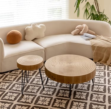 These nesting tables are both functional and charming. The natural wood finish and subtle handcrafted ring motif give them a rustic, French-country feel. Use them together in a compact living room, or separate them when you need extra surface space for drinks, plants, or décor.